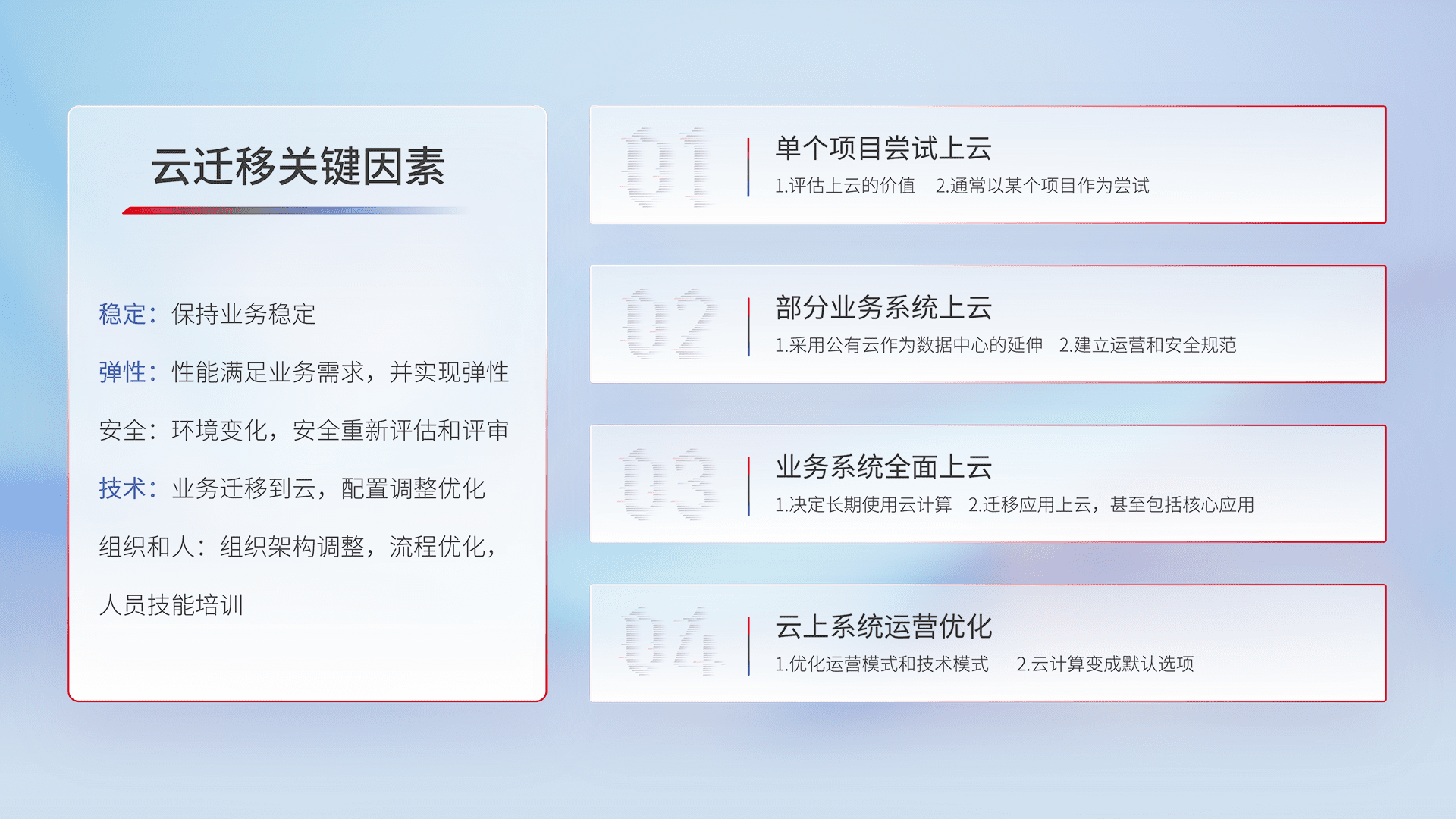 结合实际业务,,,从规划设计、、、云平台选型、、云原生改造、、、、数据迁移、、集成交付,,迁移全过程为客户识别最佳上云路径,,,,做好风险识别管理,,设计网络架构、、、、身份权限、、、安全审计合规、、、、操作审计、、日志审计、、监控告警策略、、、、多站点容灾设计等,,对云上基础设施进行整体规划,,提升IT治理水平,,,以满足弹性、、、、高可用、、、高性能的需求。。。